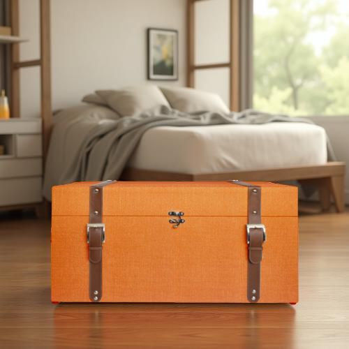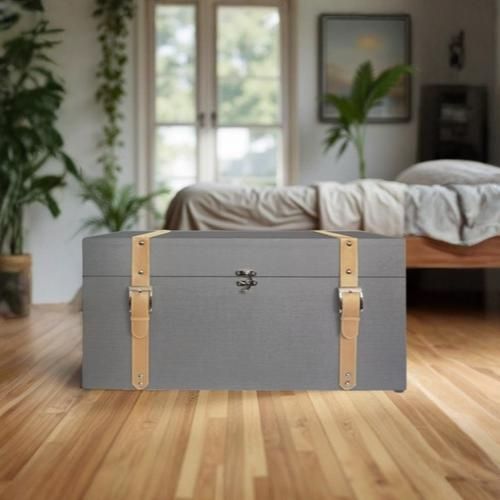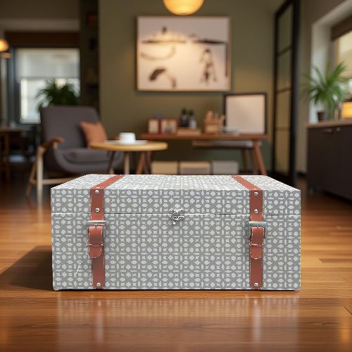 Baúl decorativo hecho en MDF, forrado a mano con papel laminado en colores elegantes. Incluye herrajes de piel y broche metálico. Ideal para almacenar con estilo. Medidas: 54×32×24 cm. Diseño funcional y artesanal.