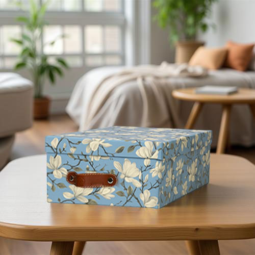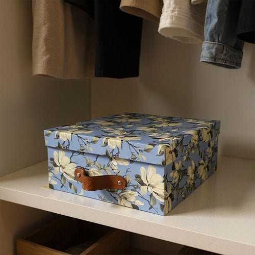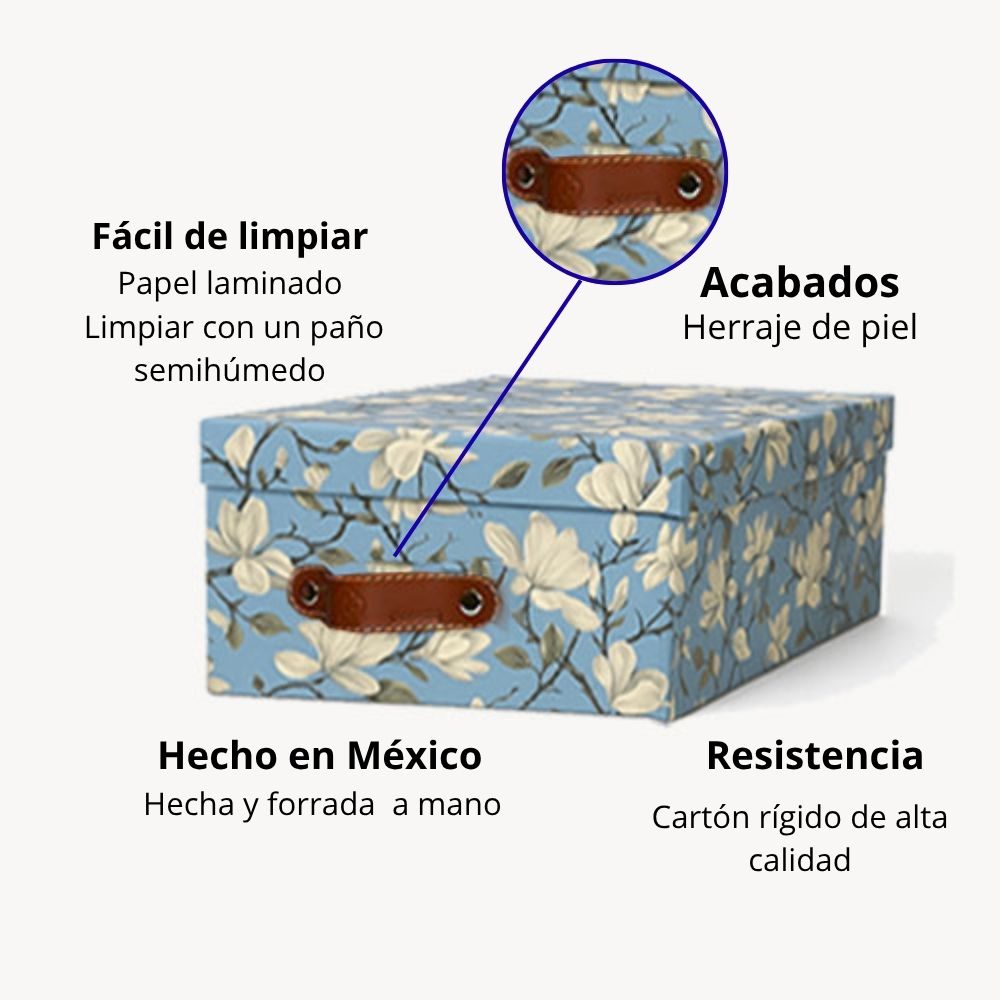 Caja organizadora con diseño, forrada a mano en cartón rígido con papel laminado con textura Monograma color Magnolia Blue. Su tono neutro aporta elegancia, calma y orden a cualquier espacio. Ideal para organizar, decorar tu closet con estilo . Hecha artesanalmente en México por Duartee&Co Disponible en cinco tamaños (S, M, L, XL y XXL), es perfecta para organizar ropa, juguetes, documentos, accesorios u objetos personales, aportando orden y estilo en cualquier espacio