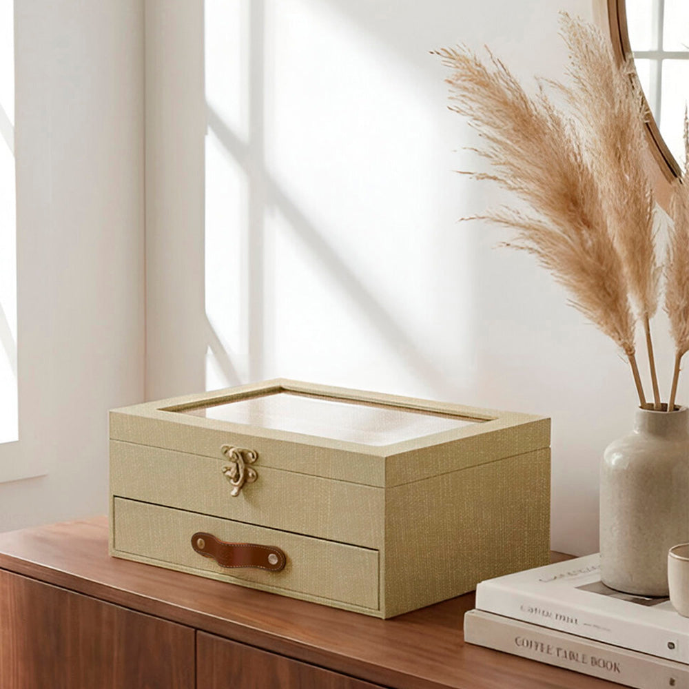 Guarda y cuida tu colección de relojes con esta elegante relojera forrada a mano. Ambas versiones cuentan con una ventana de vidrio transparente, ideal para mostrar tus relojes sin necesidad de abrir la caja, y un broche metálico frontal que aporta seguridad y elegancia.