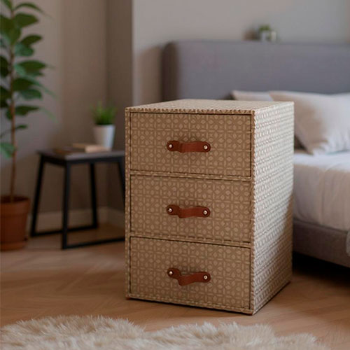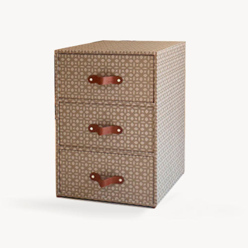 Funcionalidad y diseño se encuentran en esta cajonera de 3 cajones, perfecta para dormitorios, oficinas o espacios de trabajo con estilo. Su estructura está elaborada en MDF resistente, mientras que los cajones están hechos en cartón rígido y todo el conjunto está forrado a mano con papel laminado en un elegante diseño monograma arena. Cada cajón cuenta con un herraje de piel grabado con la marca Duartee & Co, aportando un detalle artesanal que la distingue. Su tamaño compacto la hace ideal para organizar papelería, accesorios, documentos o artículos personales. Medidas: 45 cm de frente x 45 cm de fondo x 62 cm de alto Cuidado: limpiar con paño semihúmedo.
