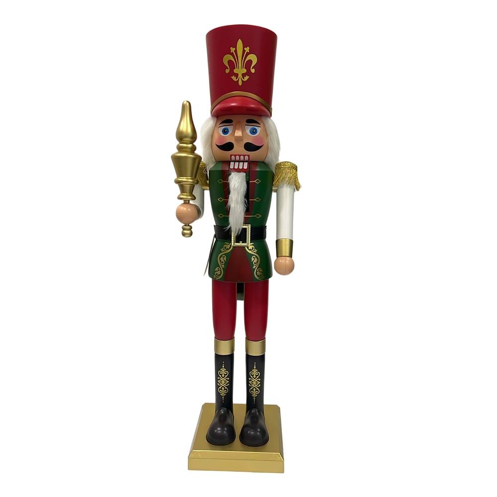 Decoración navideña de cascanueces hecho en resina color rojo con verde.