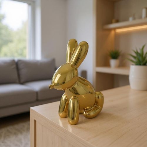 Conejo dorado. Pieza decorativa funcional, ideal para complementar interiores modernos o clásicos. Aporta textura, volumen o color a cualquier espacio según su diseño, tamaño y material. Cuidado: limpiar con paño seco o semihúmedo según material.