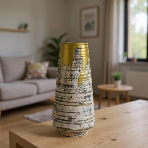 Florero rayas dorado. Pieza decorativa funcional, ideal para complementar interiores modernos o clásicos. Aporta textura, volumen o color a cualquier espacio según su diseño, tamaño y material. Cuidado: limpiar con paño seco o semihúmedo según material.