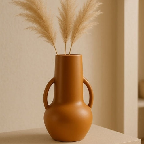 Este jarrón de cerámica en color terracota con dos asas laterales es una pieza decorativa con encanto artesanal y cálido. Su acabado mate y forma clásica con un toque moderno lo convierten en un objeto versátil para decorar estanterías, mesas auxiliares o como centro de mesa. Ideal para usar con flores secas, tallos verdes o simplemente como elemento escultural. El tono terracota aporta textura y calidez a espacios contemporáneos, rústicos o bohemios.