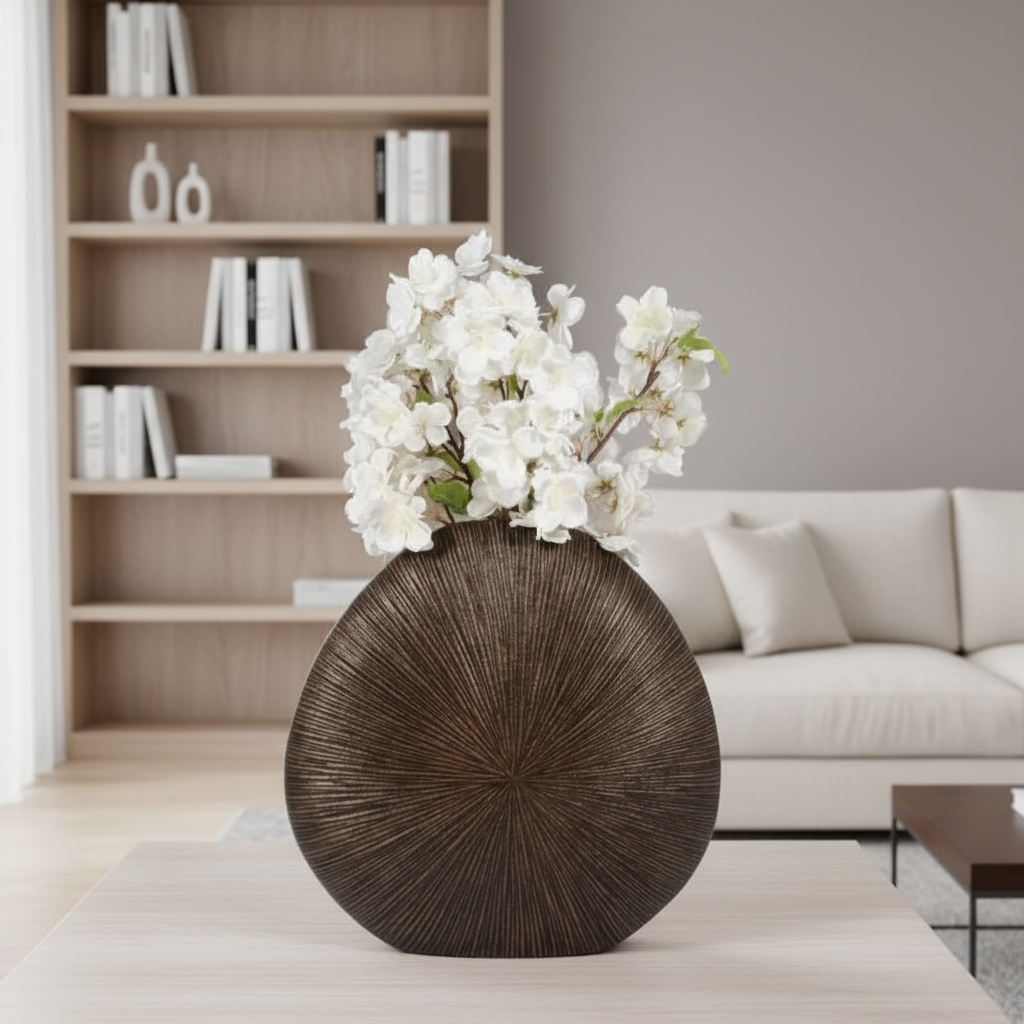 Jarrón decorativo de metal en tono cobre Su diseño texturizado estilo starburst aporta carácter, brillo y profundidad visual, creando un acento moderno y elegante. Ideal para colocar sobre mesas, repisas o consolas, ya sea solo como pieza escultórica o acompañado de follaje decorativo para realzar la expresión artística del espacio.