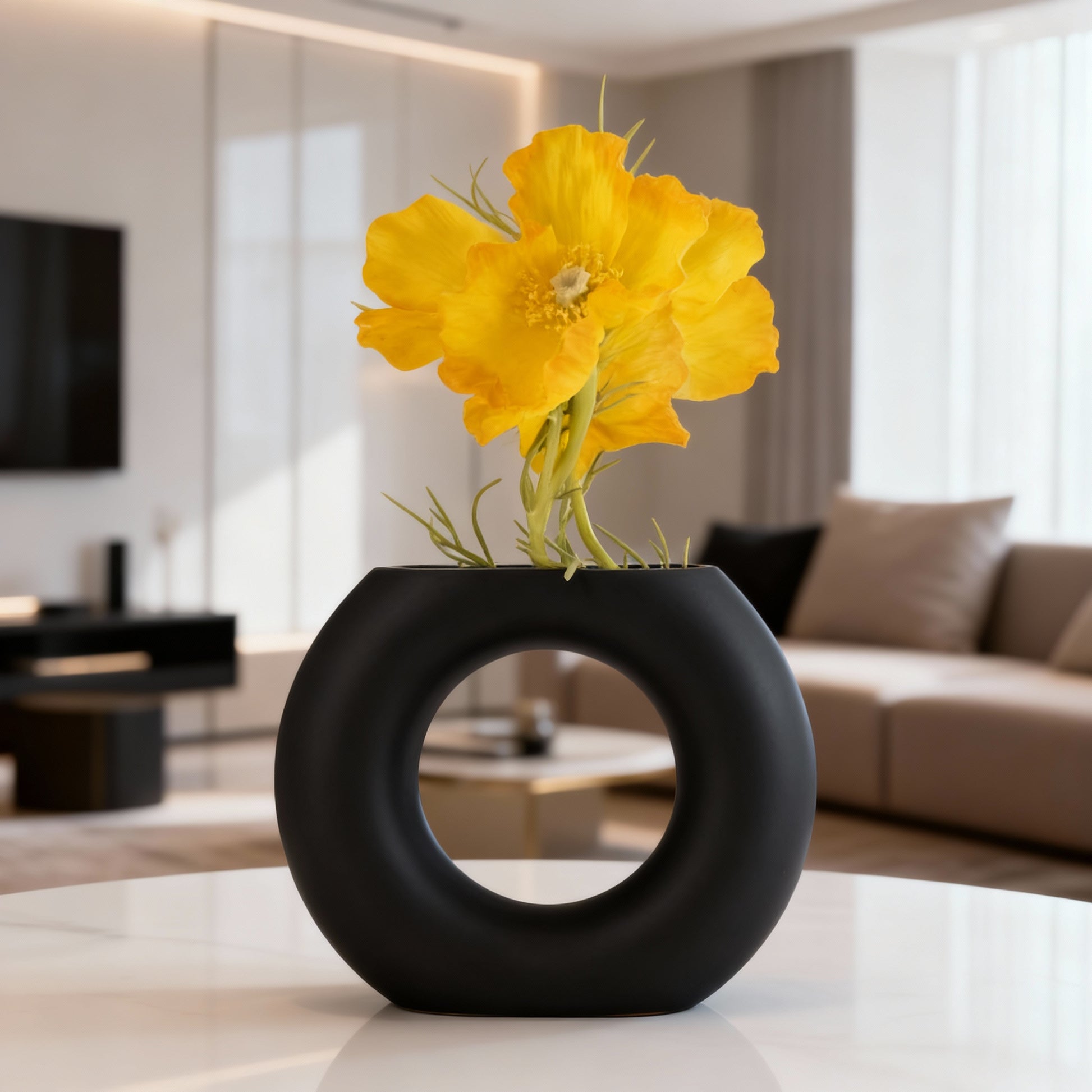 Jarrón decorativo de cerámica en color negro con acabado mate y diseño tipo dona. Cuenta con una abertura superior integrada en el borde, creando un aspecto escultórico y minimalista. Perfecto para colocar flores, ramas o follaje delicado, aportando un toque moderno y elegante a mesas, repisas o consolas.