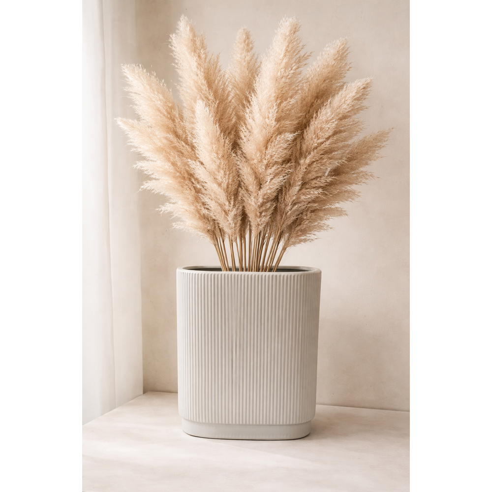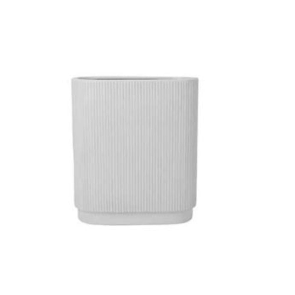 Jarrón de cerámica en color blanco con un diseño estriado (con relieves/líneas) de forma rectangular.
