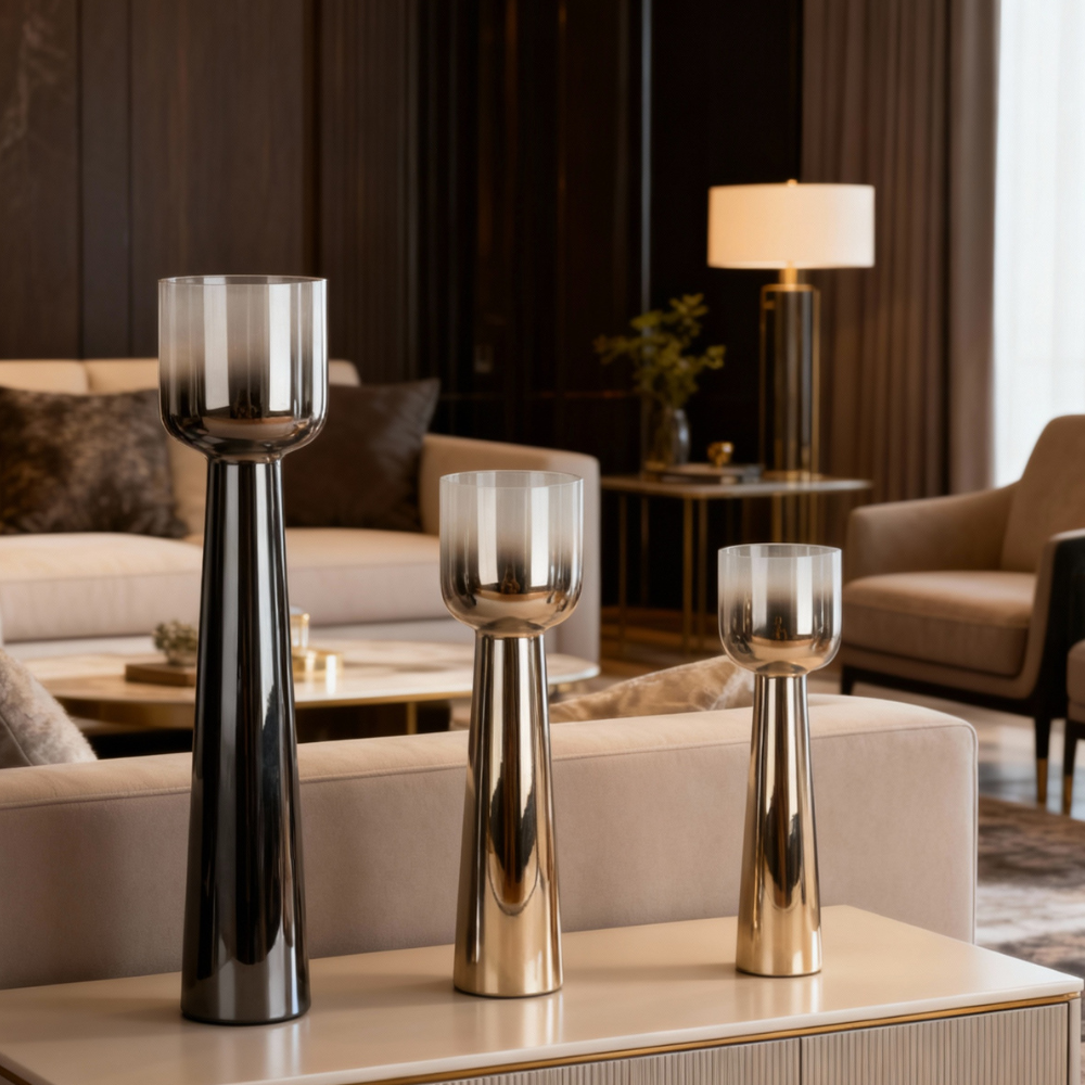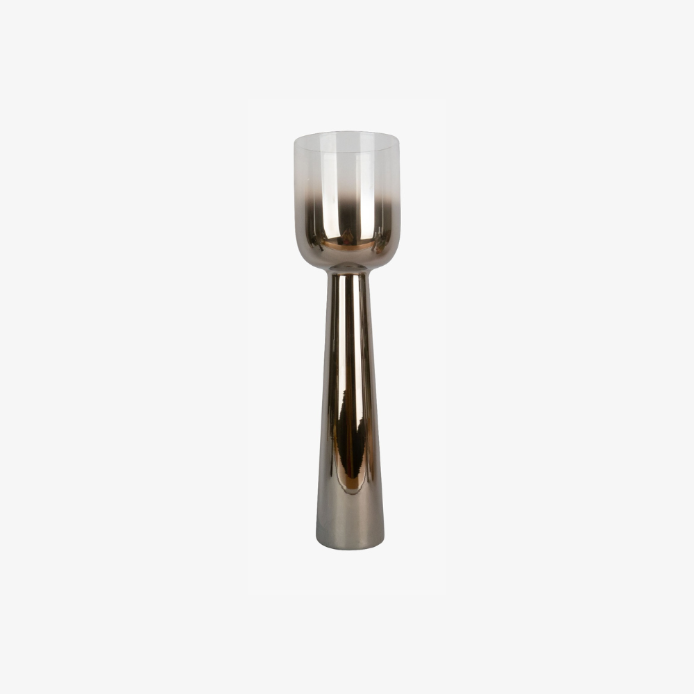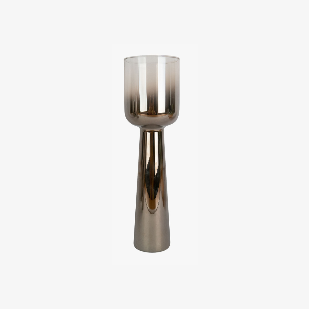 Base o jarrón decorativo con diseño moderno y elegante. Cada pieza cuenta con una base cónica de vidrio con acabado metálico en tonos dorado o plateado, y una parte superior de vidrio ahumado en forma cilíndrica. Versátiles y sofisticados, pueden utilizarse como portavelas para velas de pilar o como jarrones para colocar flores o ramas secas. Perfectos para dar un toque contemporáneo y refinado a cualquier espacio del hogar.
