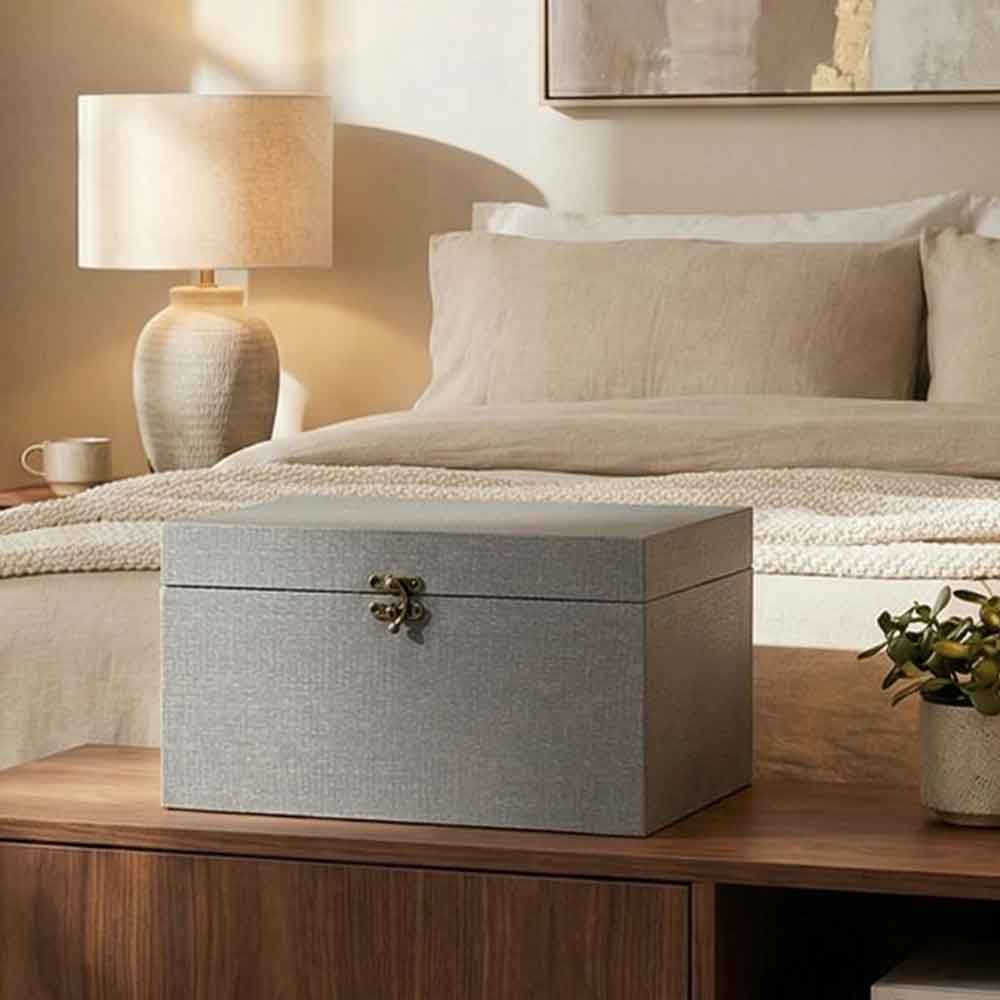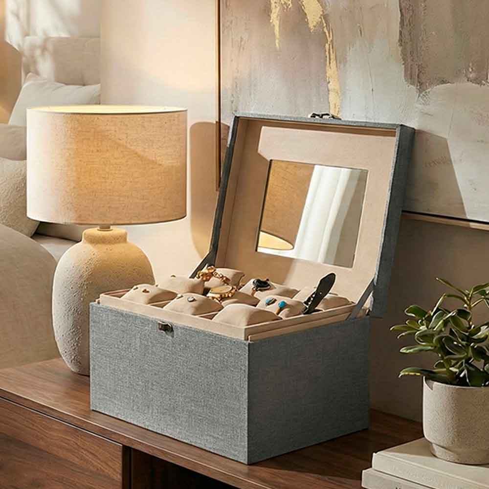 Organiza tus accesorios y joyas con estilo gracias a este joyero tipo bandeja, elaborado en cartón rígido y forrado a mano con papel laminado con impresión de textura tipo lino, que aporta elegancia y durabilidad. Su diseño abierto facilita el acceso y la visibilidad de tus piezas favoritas, ideal para usar sobre tocadores, escritorios o mesas auxiliares. Perfecto para guardar anillos, pulseras, relojes y pequeños accesorios, manteniéndolos ordenados y protegidos. Cuidado: limpiar con paño semihúmedo.