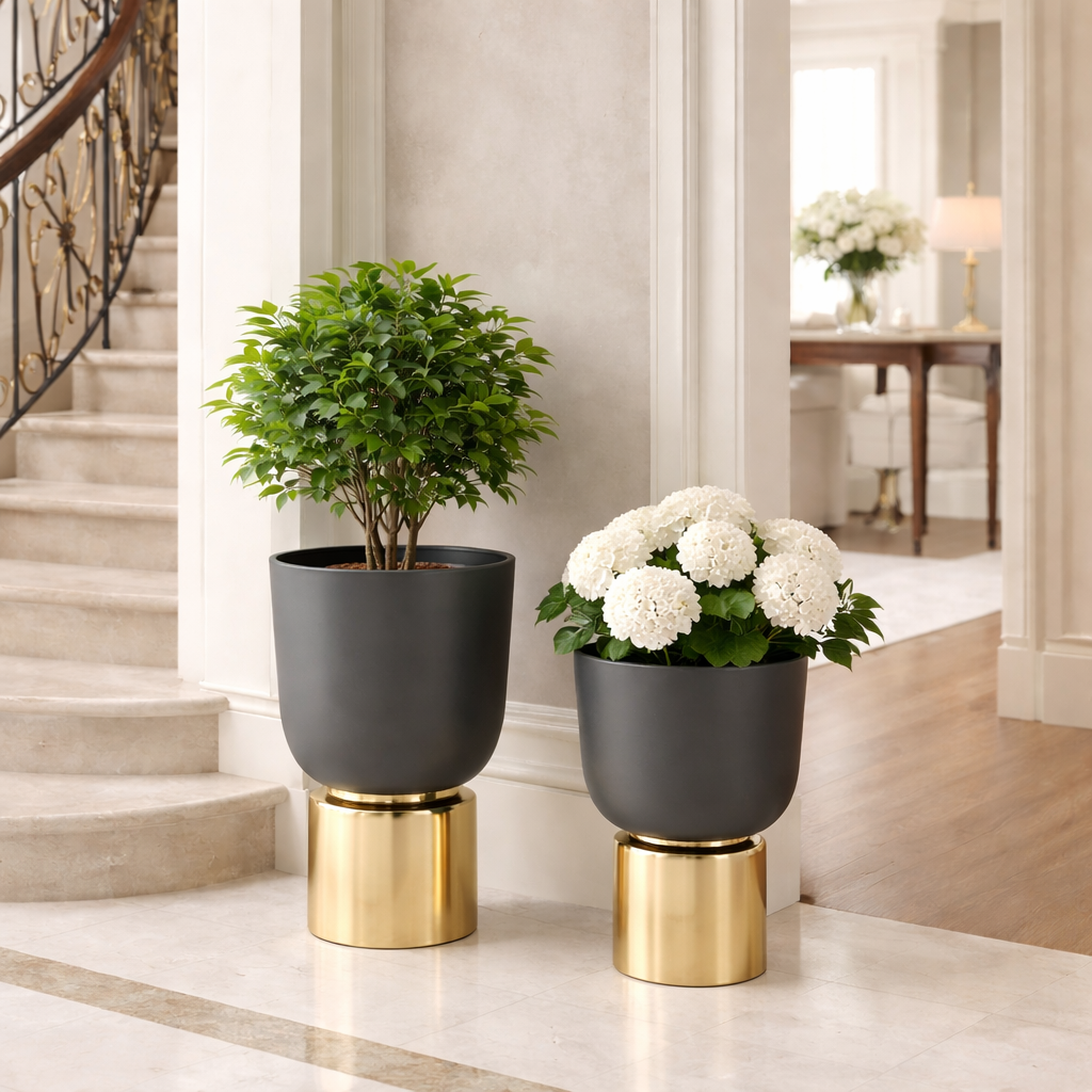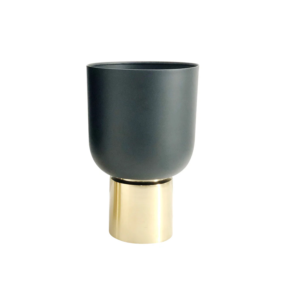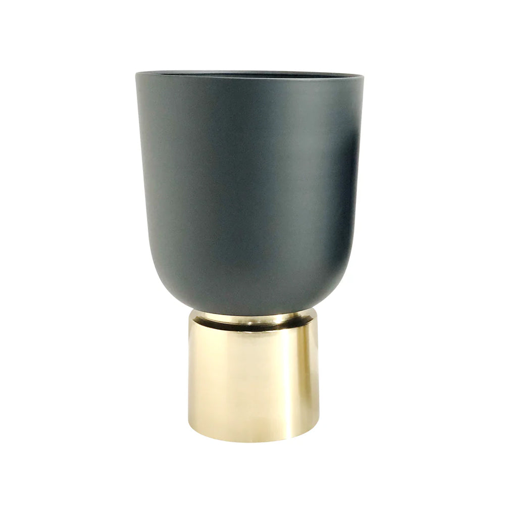 Maceta decorativa hecha en cerámica con acabado mate en color negro. De base, una estructura metálica en color dorado. Ideal para colocar flores frescas, ramas o simplemente como pieza decorativa que ilumina y eleva el estilo de cualquier espacio.