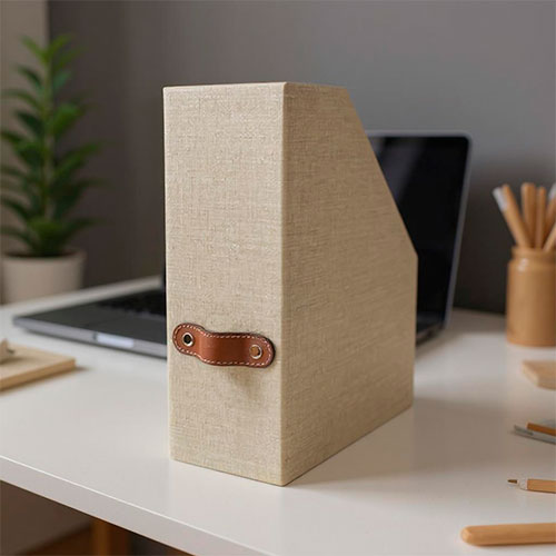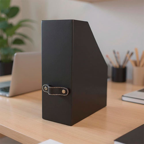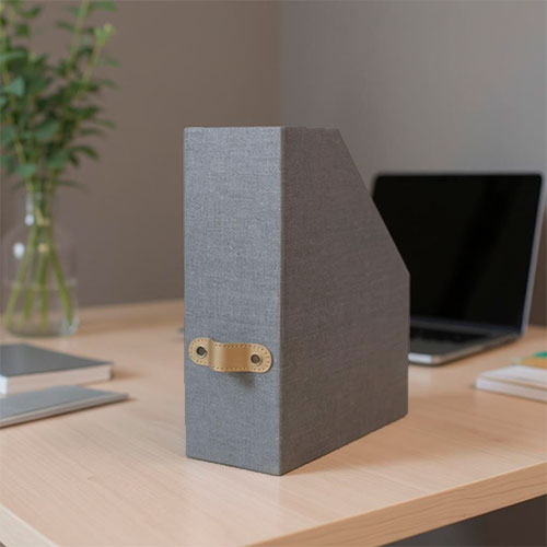 Este revistero forrado a mano es la solución perfecta para mantener en orden revistas, catálogos o carpetas, sin perder el estilo. Fabricado en cartón rígido de alta calidad y forrado con papel laminado impreso en textura tipo lino, aporta un toque sobrio y decorativo a tu escritorio, sala, oficina o estudio. Su diseño vertical y estructura firme permite organizar fácilmente tus materiales de lectura o trabajo, mientras su acabado artesanal eleva cualquier espacio.